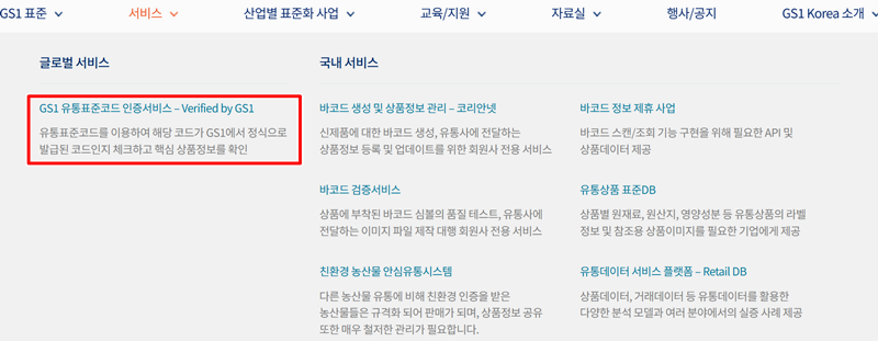 2. 나타난 메뉴 중 'GS1 유통표준코드 인증서비스 - Verified by GS1'을 선택해 주세요. 이 서비스는 유통표준코드를 활용하여 해당 코드가 GS1에서 정식으로 발급된 코드인지 확인하고 핵심 상품 정보를 찾아볼 수 있는 기능입니다.