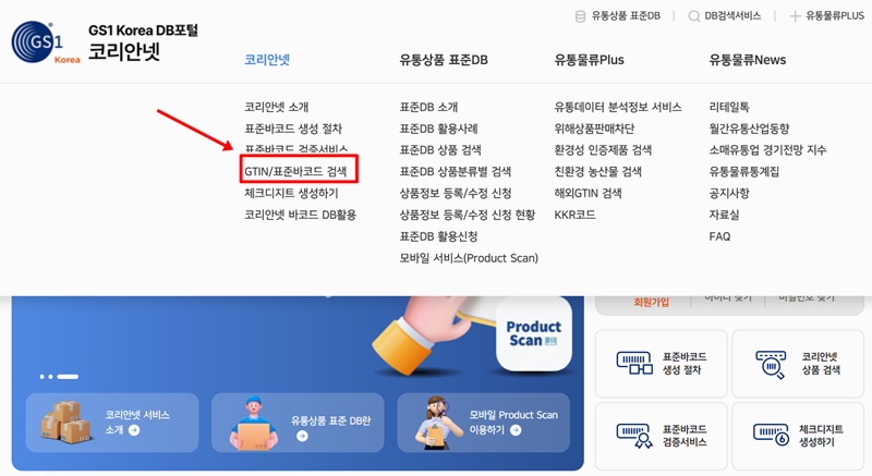 6. 다른 방법으로, '코리안넷' 즉 GS1 Korea DB 포털에 접속하여 'GTIN/표준바코드 검색' 메뉴를 이용할 수도 있습니다. 이 방법으로 상품 데이터베이스에 직접 접근하여 더욱 상세한 정보를 찾아볼 수 있습니다.