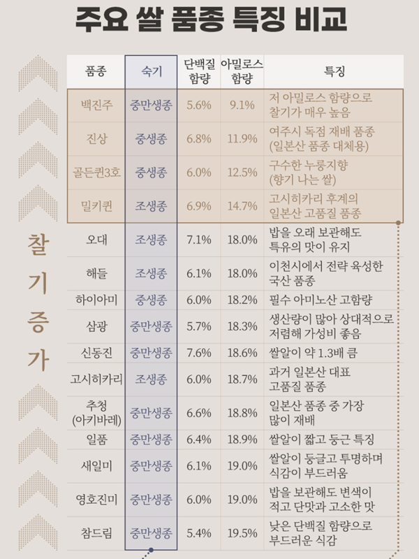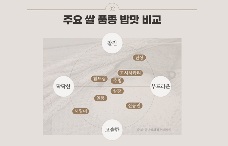 6. 각 쌀 품종이 가진 밥맛의 특징을 보기 쉬운 좌표 그림으로 정리해 두었어요. 찰진 정도와 부드러운 정도를 기준으로 신동진, 추청, 일품 등 여러 품종이 어디에 위치하는지 보여주어, 내가 선호하는 식감의 쌀을 직관적으로 고르는 데 큰 도움을 줍니다.