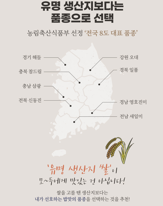 7. 유명한 쌀 생산지 이름만 보고 고르는 것보다 품종 자체에 집중하는 것이 좋다는 점을 알려줘요. 경기 해들, 충남 삼광, 전북 신동진처럼 각 지역을 대표하는 쌀 품종을 지도와 함께 소개해, 지역이 아닌 품종을 기준으로 나만의 쌀을 선택할 수 있도록 안내합니다.