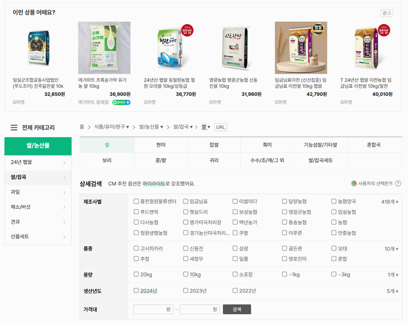 1. 쌀/농산물 카테고리에서는 다양한 상세 검색을 할 수 있어요. 제조사나 품종은 물론, 용량이나 생산년도 같은 구체적인 조건까지 설정해서 내가 원하는 기준에 맞는 쌀만 골라볼 수 있도록 범위를 좁혀 나갈 수 있습니다.