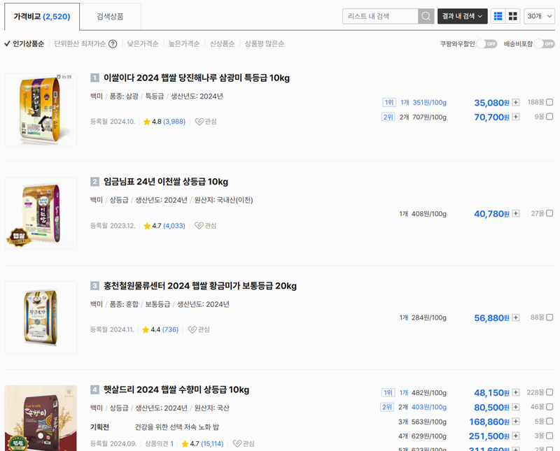 2. 원하는 조건으로 검색을 마치면 여러 상품이 목록으로 나타나요. 인기상품을 선택하면 가장 인기있는 1순위 쌀 부터 알아볼 수 있고 여기서는 다양한 상품의 가격을 한눈에 비교할 수 있고, 다른 사람들의 상품평 점수나 후기를 참고하여 어떤 쌀이 좋은 평가를 받고 있는지 확인할 수 있습니다.