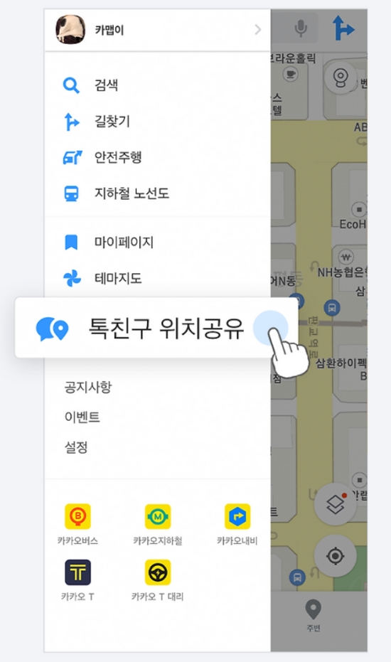 5. 현재 내 위치를 파악했다면, 이 정보를 다른 사람과 나눌 수도 있습니다. 메뉴 화면에서 '톡친구 위치공유'와 같은 기능을 찾아보세요. 약속 장소를 정하거나, 친구나 가족에게 내가 안전하게 어디에 있는지 알려줘야 할 때 이 기능을 활용하면 말로 설명하는 것보다 훨씬 빠르고 정확하게 내 위치를 전달할 수 있습니다.