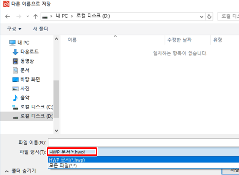 8. 마지막으로 파일을 어디에 어떤 이름으로 저장할지 정하는 창이 나타납니다. 파일 형식이 'HWP 문서'로 되어 있는 것을 확인한 뒤 저장하면 모든 변환 과정이 끝납니다.