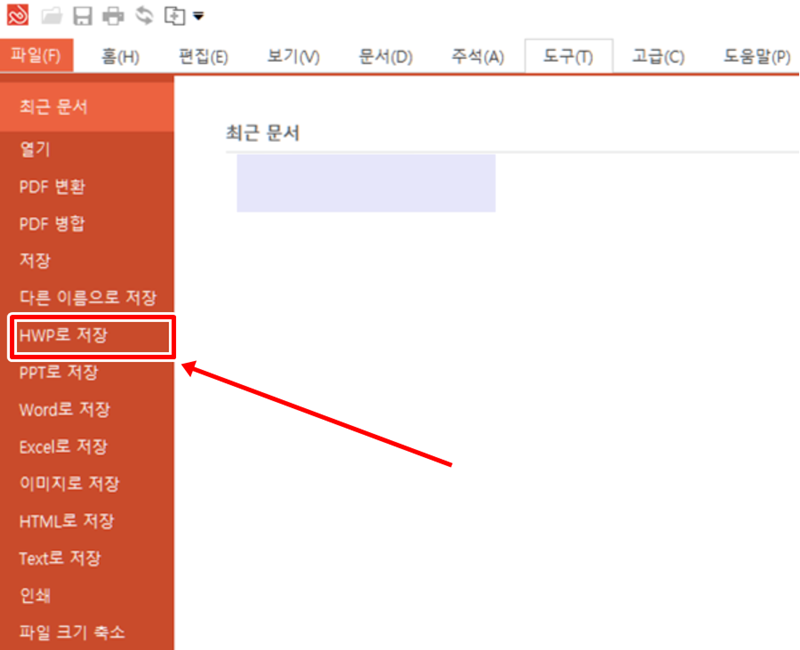 6. 파일을 불러온 후, 화면 왼쪽 상단의 '파일(F)' 메뉴를 엽니다. 여러 저장 항목 중에서 'HWP로 저장'을 찾아 선택하면 본격적인 변환 과정을 시작할 수 있습니다.
