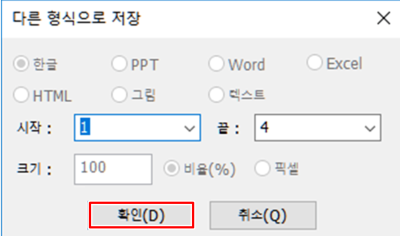7. '다른 형식으로 저장' 창이 나타나면 변환할 파일 형식이 '한글'로 맞게 되어 있는지 확인합니다. 이후 페이지 범위 등을 설정하고 하단의 '확인'을 눌러주면 됩니다.