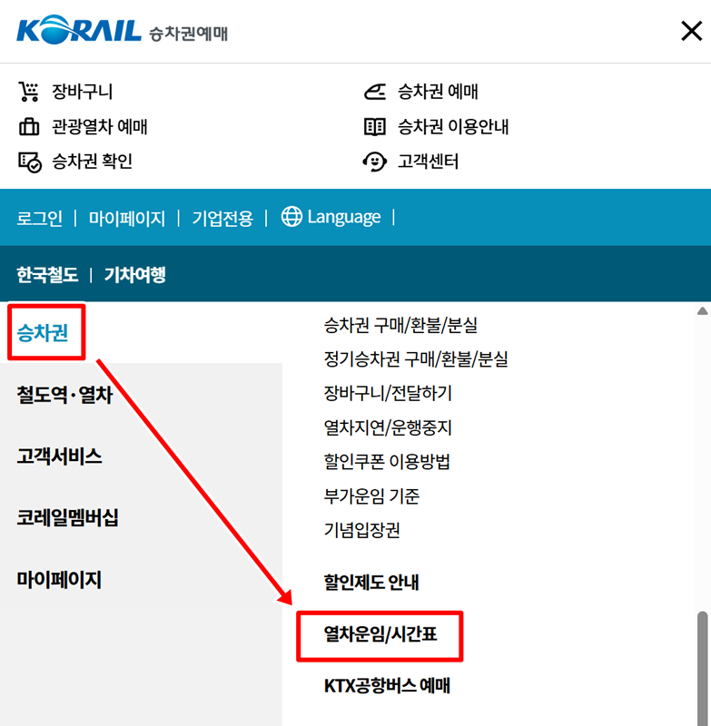 8. 홈페이지 메인 화면에서 바로 조회하는 것 외에 전체 메뉴를 통해서도 시간표를 찾을 수 있습니다. 상단 메뉴에서 '승차권'을 선택한 뒤, 하위 메뉴에 있는 '열차운임/시간표'로 들어가면 됩니다.