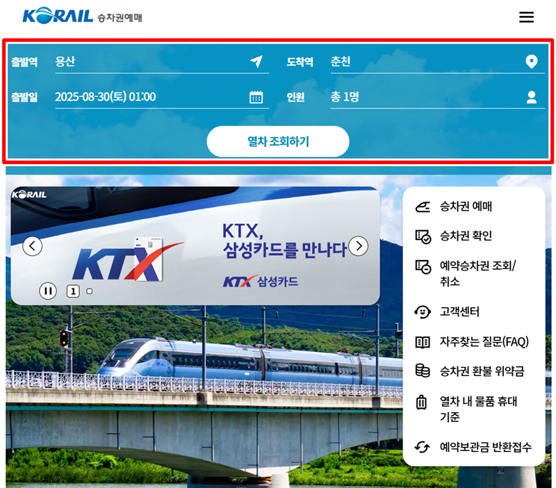 1. 홈페이지에 접속하면 출발역과 도착역, 날짜와 인원수를 정하는 화면이 가장 먼저 보입니다. 예를 들어 용산에서 춘천으로 가는 여정을 알아보고 싶다면, 각 항목에 맞게 정보를 입력한 후 '열차 조회하기'를 선택해 주세요.