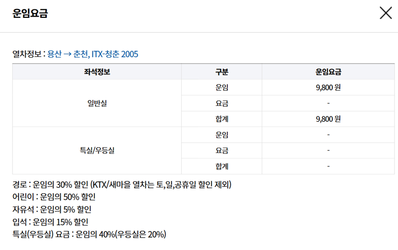 6. '운임요금'을 선택하면 일반실과 특실의 기본 요금과 함께 경로, 어린이, 유아 등 조건에 따른 할인 정보도 자세히 안내됩니다. 이를 통해 여행 경비를 미리 계획하거나 받을 수 있는 혜택이 있는지 꼼꼼히 확인할 수 있습니다.