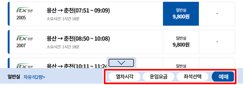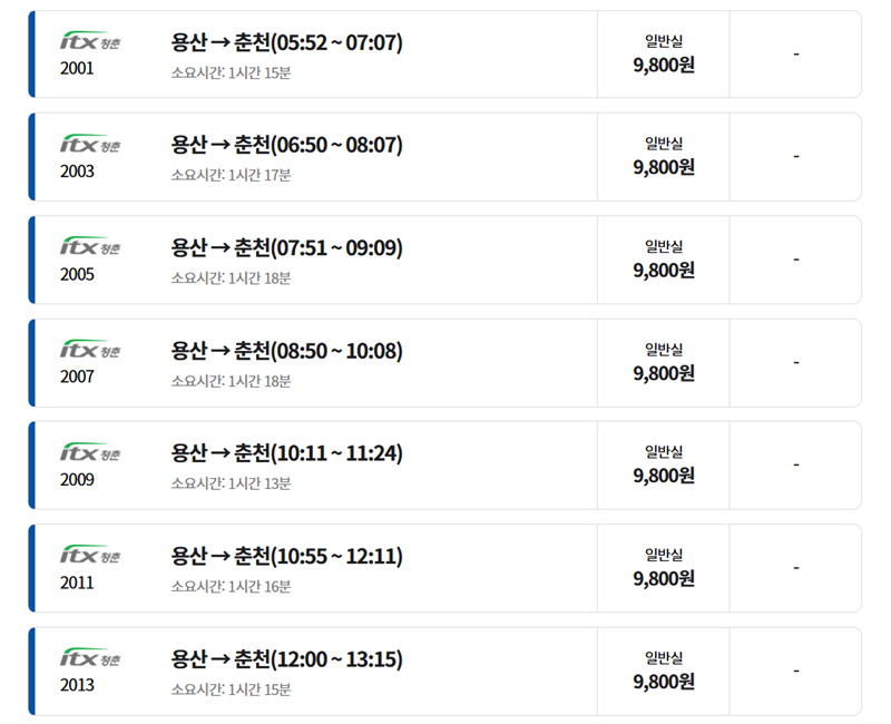 3. 원하는 열차를 선택하면 용산에서 춘천까지 가는 시간대별 목록이 나옵니다. 출발 시간과 도착 시간, 걸리는 시간은 물론 일반실 요금이 9,800원이라는 사실까지 한눈에 파악할 수 있어 내 일정에 맞는 기차편을 고르기 수월합니다.