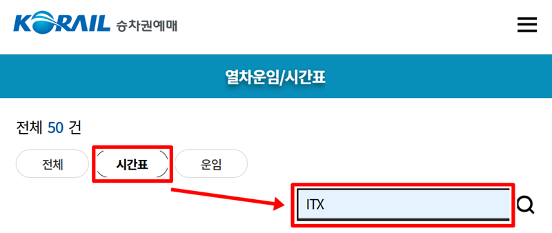 9. '열차운임/시간표' 페이지로 이동한 후, '시간표'를 선택하고 검색창에 'ITX'라고 입력해 보세요. 이렇게 하면 ITX-청춘을 포함한 ITX 열차의 전체 시간표 자료를 찾아볼 수 있습니다.