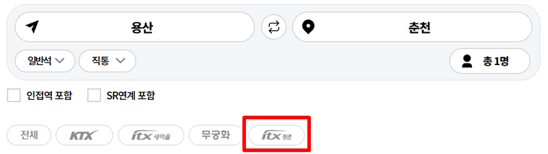 2. 조회를 마치면 해당 노선을 운행하는 여러 종류의 열차가 나타납니다. 여기서 내가 원하는 'ITX-청춘'을 선택하면, 다른 열차는 제외하고 ITX-청춘의 운행 정보만 따로 모아서 확인할 수 있어 편리합니다.