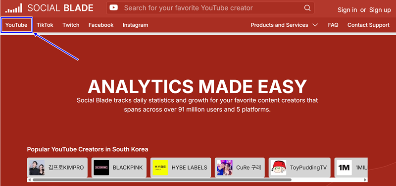 1. 홈페이지에 들어간 후, 화면 왼쪽 위에 여러 소셜 미디어 이름이 나열된 것을 볼 수 있습니다. 여기서 가장 첫 번째에 있는 'YouTube'를 선택하면 유튜브 채널과 관련된 다양한 순위와 정보를 볼 수 있는 화면으로 이동하게 됩니다.