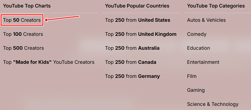 2. 다음 화면에서는 여러 가지 기준으로 정리된 유튜브 순위 목록이 나타납니다. 'YouTube Top Charts'라는 항목 아래에 있는 'Top 50 Creators'를 선택하면, 전 세계에서 가장 영향력 있는 상위 50개의 채널 목록을 확인할 수 있는 화면으로 넘어갑니다.