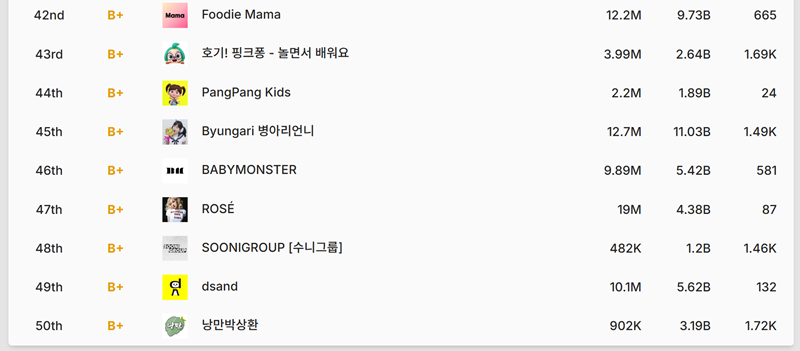 5. 화면을 아래로 계속 내리면 50위까지의 전체 순위를 모두 확인할 수 있습니다. 상위권뿐만 아니라 다양한 분야에서 꾸준히 사랑받고 있는 채널들을 발견할 수 있습니다. 이를 통해 현재 우리나라 유튜브 트렌드를 파악하는 데에도 도움이 됩니다.