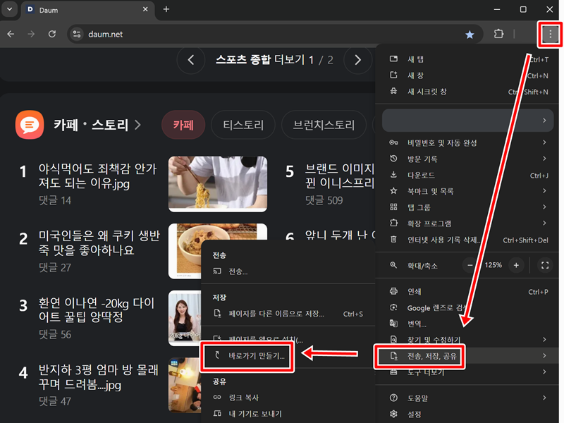 6. 크롬 브라우저를 사용한다면 더 쉬운 길이 있어요. 오른쪽 위에 있는 점 세 개 모양의 메뉴를 열고, '저장 및 공유'를 거쳐 '바로가기 만들기'를 찾아주세요.