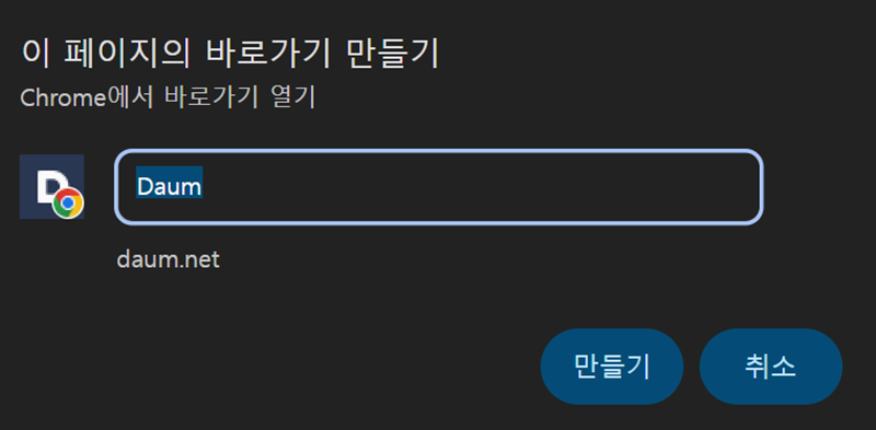 7. '이 페이지의 바로가기 만들기'라는 작은 창이 나타나면, 아이콘의 이름을 원하는 대로 설정할 수 있어요. 이름을 정한 뒤 '만들기'를 눌러주면 모든 과정이 끝나요.