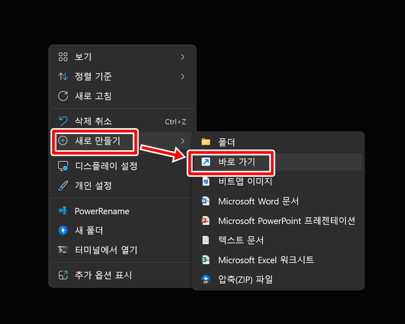 3. 다른 방법으로는, 바탕화면의 빈 곳에서 마우스 오른쪽을 눌러 나타나는 메뉴 중 '새로 만들기'를 선택하고, 이어서 '바로 가기' 항목으로 들어가 주세요.