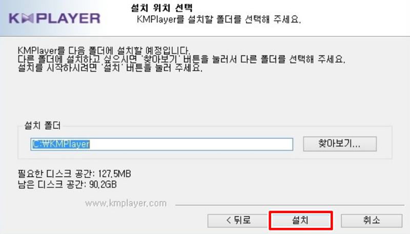 7. 프로그램이 컴퓨터의 어느 위치에 저장될지 경로를 정하는 단계입니다. 보통 기본적으로 설정된 폴더에 그대로 두는 경우가 많지만, 원한다면 '찾아보기'를 통해 사용자가 원하는 다른 경로로 바꿀 수도 있습니다. 위치를 확정했다면 '설치'를 눌러줍니다.