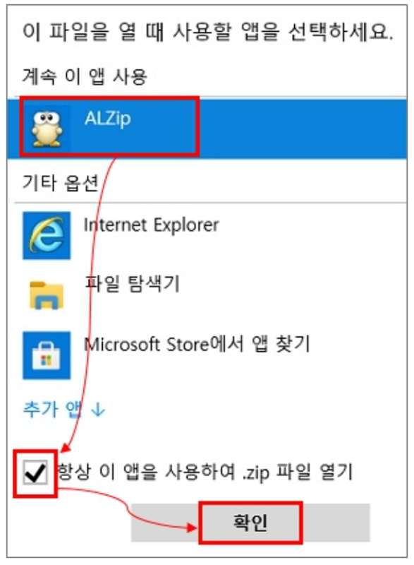6. 앞으로 이 파일을 열 때 사용할 프로그램을 선택하는 화면이 나타납니다. 목록에서 '알집(ALZip)'을 선택하고, 아래에 있는 '항상 이 앱을 사용하여 .zip 파일 열기' 항목에 체크한 후 '확인'을 눌러주세요. 이제부터는 EGG나 ZIP 같은 압축 파일을 더블클릭하기만 해도 자동으로 알집이 실행되어 편리하게 이용할 수 있습니다.