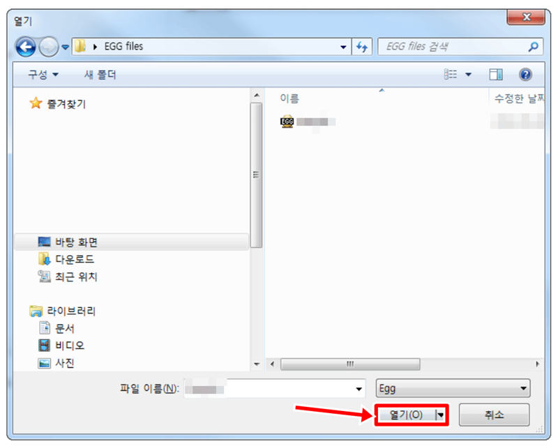 3. 파일 탐색기 창이 열리면 내가 압축을 풀고 싶은 EGG 파일이 저장된 위치로 이동합니다. 파일을 찾았다면 마우스로 선택한 뒤, 창 오른쪽 아래에 있는 '열기' 부분을 눌러주세요. 이렇게 하면 해당 압축 파일이 프로그램 안으로 불러와지면서 내용물을 확인할 수 있는 상태가 됩니다.
