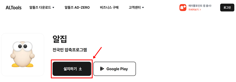 1. 먼저 EGG 파일을 다룰 수 있는 프로그램을 준비해야 합니다. 알집 공식 홈페이지에 방문하면 '설치하기'라는 문구를 쉽게 찾을 수 있는데요, 이것을 눌러 설치 파일을 내려받은 후 실행해서 컴퓨터에 프로그램을 설치해주세요. 설치 과정은 복잡하지 않아서 안내에 따라 몇 번 진행하면 금방 끝납니다.