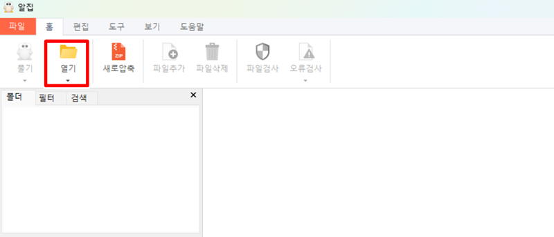 2. 프로그램 설치를 마쳤다면 이제 압축을 풀 파일을 열어볼 차례입니다. 설치된 알집 프로그램을 실행하면 상단에 여러 메뉴가 보이는데, 그중에서 '열기'라고 쓰인 폴더 모양의 아이콘을 선택해주세요. 그러면 컴퓨터에 저장된 파일을 불러올 수 있는 탐색기 창이 나타납니다.