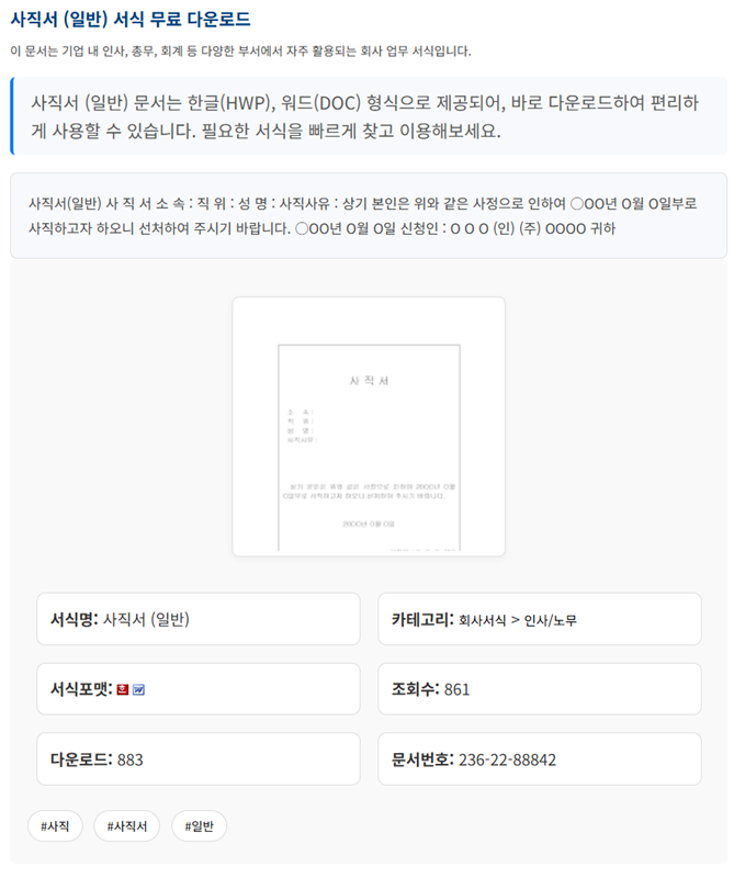 4. 선택한 '사직서 (일반)' 서식의 상세 정보 페이지로 이동합니다. 여기서는 문서의 미리보기 이미지와 함께 서식명, 카테고리, 조회수, 다운로드 수 등의 구체적인 내용을 다시 한번 확인할 수 있습니다.