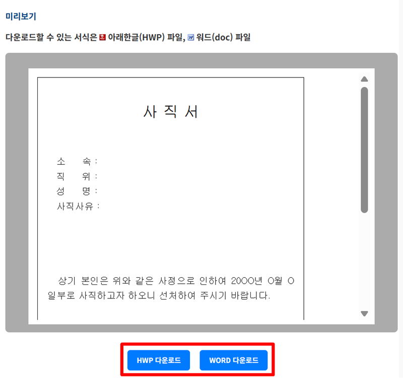 5. 내용을 확인한 후 파일을 내려받을 차례입니다. 화면을 아래로 내리면 문서 전체를 미리 볼 수 있고, 바로 아래에 'HWP 다운로드'와 'WORD 다운로드'가 있습니다. 자신이 사용하기 편한 파일 형식을 선택하여 받으면 됩니다.