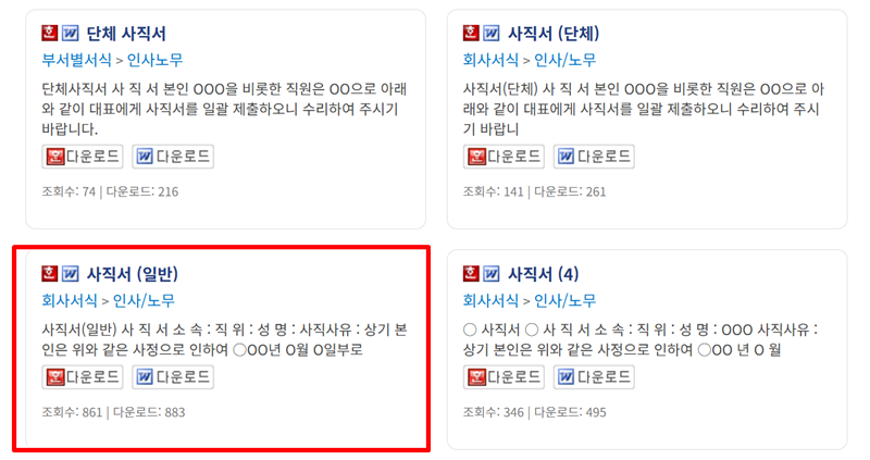 3. 여러 양식 중에서 가장 일반적으로 사용할 수 있는 '사직서 (일반)' 항목을 선택합니다. 각 서식 아래에는 조회수와 다운로드 횟수가 표시되어 있어 어떤 양식이 많이 사용되는지 참고할 수 있습니다.
