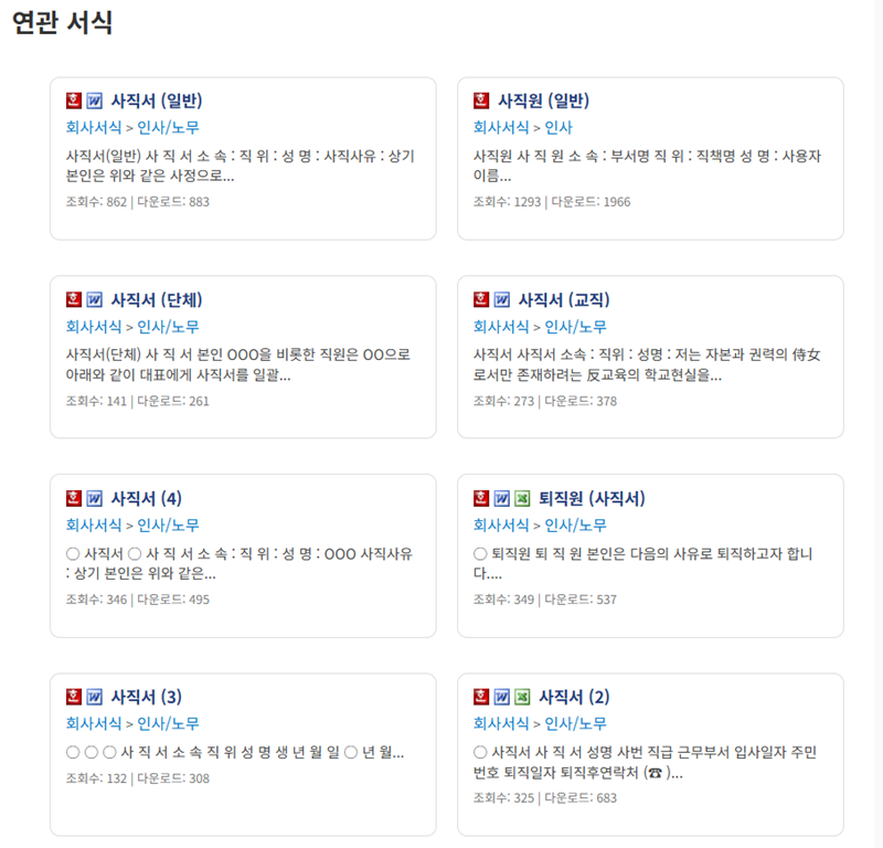 6. 현재 보고 있는 서식 외에도 페이지 하단에는 '연관 서식' 목록이 함께 표시됩니다. 사직원, 퇴직원 등 비슷한 종류의 다른 문서들도 있으니, 필요하다면 둘러보고 자신에게 더 맞는 양식이 있는지 확인해 보는 것도 좋습니다.