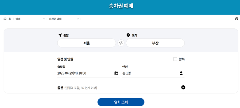 3. 이제 본격적으로 여행 계획을 입력할 차례입니다. 출발지와 도착지를 설정하고, 여행을 떠날 날짜와 시간, 그리고 함께할 인원수를 정확하게 기입합니다. 모든 정보를 입력했다면 화면 아래의 '열차 조회'를 눌러 해당 조건에 맞는 기차편을 찾아봅니다.