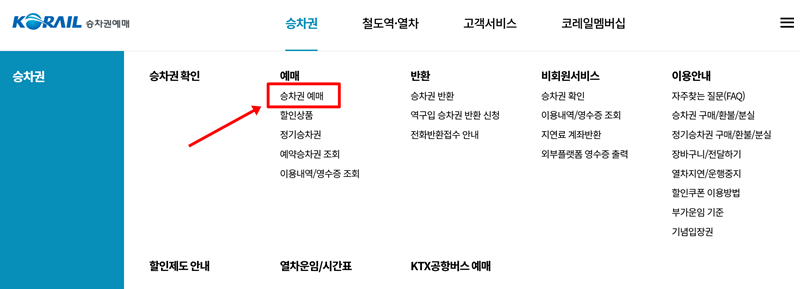 1. 가장 먼저 상단에 있는 주 메뉴에서 '승차권' 항목을 살펴봅니다. 이곳은 기차표와 관련된 모든 업무를 시작하는 출발점이라고 할 수 있습니다. 기차표를 사거나, 예약 내역을 확인하고 변경하는 등 여행에 필요한 대부분의 과정을 이곳에서 진행하게 됩니다.