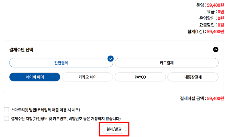 7. 마지막으로 결제 정보를 확인하고 지불을 완료하는 단계입니다. 최종 운임이 맞는지 다시 한번 살펴보고, 간편결제나 카드결제 등 본인이 사용하기 편한 방식을 고릅니다. 결제 정보를 모두 입력한 후 '결제/발권'을 누르면 모든 과정이 마무리되고, 기차표가 성공적으로 발권됩니다.