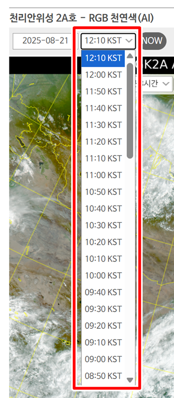 4. 영상 위쪽의 시간 표시 부분을 이용하면 과거의 모습도 돌아볼 수 있습니다. 10분 간격으로 시간을 거슬러 올라가며 구름이 어떻게 이동하고 변화했는지 살펴보는 것은 꽤 흥미로운 경험이 될 거예요.