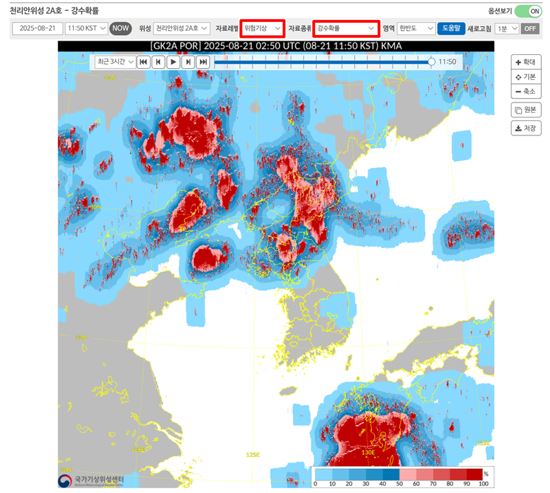 6. 만약 비가 올 확률이 궁금하다면, '자료종류'를 '강수확률'로 바꿔보세요. 지도 위에 비가 내릴 가능성이 있는 지역이 색으로 표현됩니다. 붉은색에 가까울수록 확률이 높다는 뜻이니, 외출 전 참고하면 좋겠죠.