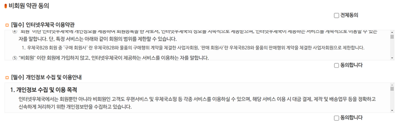 4. 비회원으로 진행할 경우, 서비스 이용을 위한 약관 동의가 필요합니다. 인터넷우체국 이용약관과 개인정보 처리에 관한 내용을 확인한 후, 각 항목 옆의 '동의합니다'에 체크하면 다음으로 넘어갈 수 있습니다.