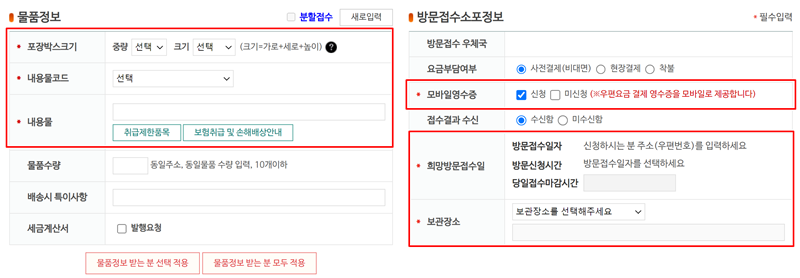6. 보내는 물품의 정보와 방문 희망 시간 등을 정합니다. 상자의 크기와 내용물의 종류를 선택하고, 요금 결제 방식과 기사님이 오셨으면 하는 날짜를 지정해 주세요. '모바일영수증'을 신청하면 문자로 영수증을 받을 수 있습니다.