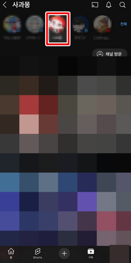 4. 여러 채널 아이콘 중에서 구독을 취소하고 싶은 채널을 선택하여 들어갑니다. 해당 채널의 홈 화면으로 이동하여 채널의 영상들을 확인할 수 있습니다.