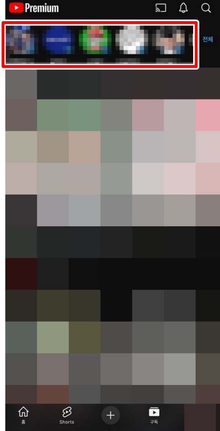 3. 구독 페이지로 이동하면 화면 상단에 내가 구독 중인 채널들의 프로필 아이콘이 가로로 나열되어 있는 것을 볼 수 있습니다. 여기서 정리하고 싶은 채널을 찾습니다.
