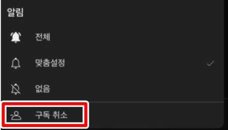 6. '구독중'을 누르면 나타나는 작은 창의 맨 아래를 보면 '구독 취소'라는 항목이 있습니다. 이 항목을 선택하면 최종적으로 해당 채널에 대한 구독이 해지됩니다.