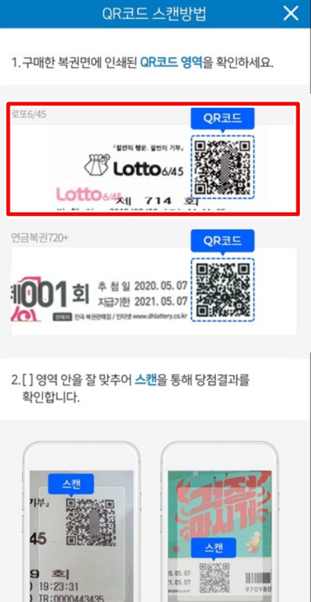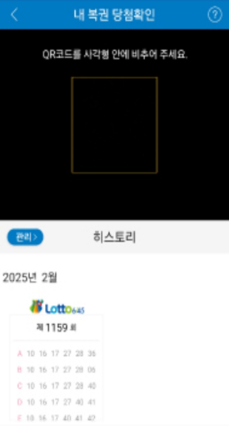 4. 스캐너가 실행되면 화면에 나타나는 사각형 안내선 안에 로또 용지의 QR코드를 맞춰주세요. 스마트폰 카메라가 코드를 인식할 수 있도록 잠시만 기다리면 자동으로 다음 화면으로 넘어갑니다.