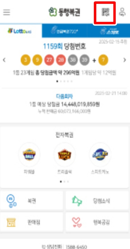 2. 앱 설치를 마치고 실행하면 메인 화면이 나타납니다. 여기서 오른쪽 위에 있는 네모난 모양의 QR코드 아이콘을 찾아 선택해 주세요. 이 아이콘이 바로 당첨 여부를 확인할 수 있는 스캐너를 실행하는 입구입니다.