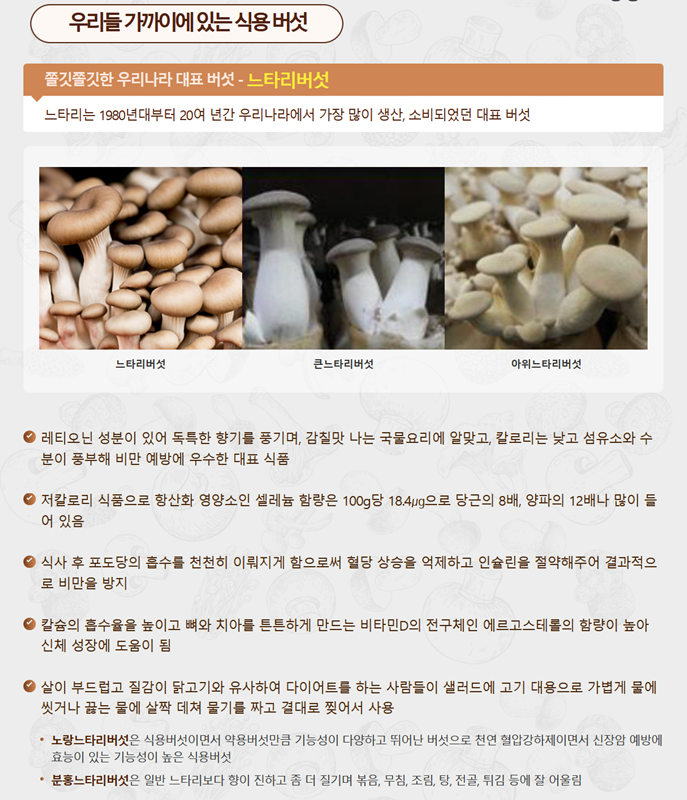 4. 가장 먼저 소개되는 것은 우리나라 대표 버섯인 '느타리버섯'이에요. 쫄깃한 식감으로 사랑받는 느타리버섯은 칼로리가 낮고 섬유소와 수분이 풍부하며, 식후 혈당 상승을 억제하는 효과가 있어 건강 관리에 도움을 주는 대표적인 식재료랍니다.