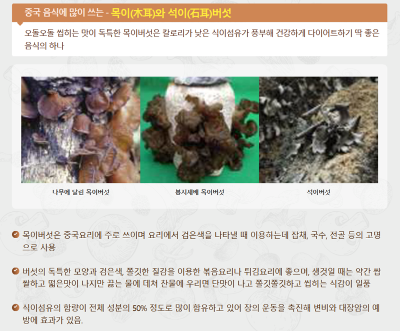 10. 중국요리에서 흔히 볼 수 있는 '목이버섯'과 '석이버섯'도 있어요. 오돌오돌 씹히는 독특한 식감이 특징인 목이버섯은 식이섬유 함량이 높아 장운동을 촉진하며 변비와 대장암 예방에 도움을 줍니다. 볶음이나 튀김 요리에 잘 어울려요.