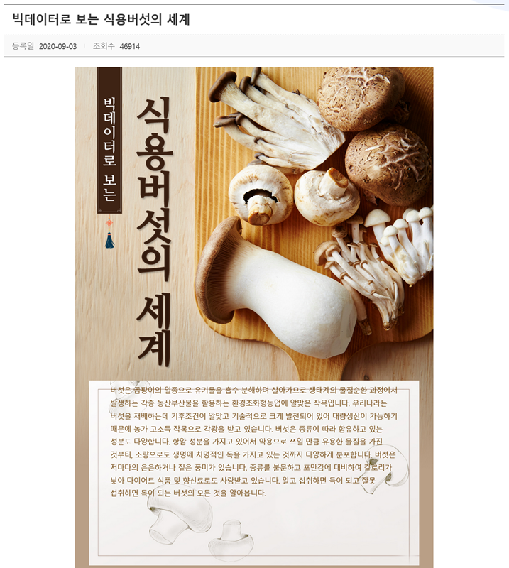2. 검색 결과에서는 여러 자료가 나타나는데, 그중 '이달의 농업기술' 부분에 있는 '빅데이터로 보는 식용버섯의 세계'라는 게시물을 발견할 수 있어요. 이 자료를 통해 우리가 몰랐던 버섯에 대한 깊이 있고 흥미로운 이야기들을 만나볼 준비를 할 수 있습니다.