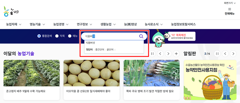 1. 농업 기술 정보를 얻을 수 있는 홈페이지 중앙에는 검색창이 마련되어 있어요. 이곳에 궁금했던 '식용버섯'을 입력하고 돋보기 모양을 누르면, 버섯과 관련된 다채로운 정보들을 한눈에 찾아볼 수 있는 검색 결과 화면으로 이동하게 됩니다.