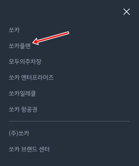 7. 단기 대여가 아닌 월 단위의 장기 이용을 원하신다면 '쏘카플랜'을 확인해야 합니다. 홈페이지 우측 상단의 전체 메뉴 아이콘을 눌러 세부 서비스 목록을 열어주세요. 이곳에서 쏘카가 제공하는 다양한 서비스들을 만나볼 수 있습니다.