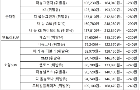 4. 준대형 세단과 소형 SUV 라인업의 요금 정보입니다. 더 뉴 그랜저는 주중 약 10만 원대, 캐스퍼는 약 7만 4천 원대부터 이용할 수 있습니다. 주행요금은 차종에 따라 1km당 220원에서 290원 수준으로 책정되어 있어, 예약 시 참고할 수 있습니다.