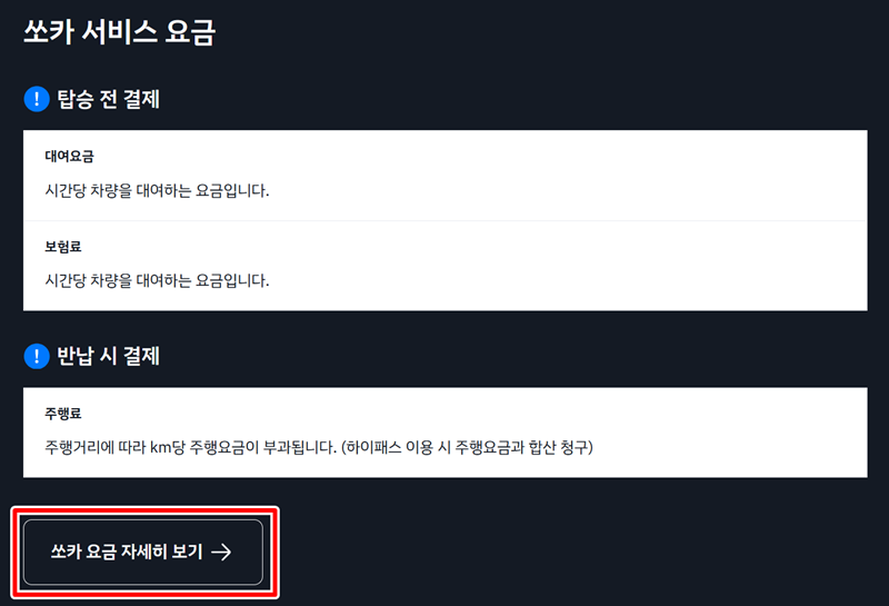 1. 쏘카의 요금은 탑승 전 결제되는 대여료 및 보호료와 반납 시 결제되는 주행료로 구성됩니다. 대여료는 시간 단위로 책정되며, 주행료는 실제 운행한 거리에 따라 km당 요금이 부과되는 방식입니다. 더 상세한 내용을 확인하려면 '쏘카 요금 자세히 보기'로 들어가세요.